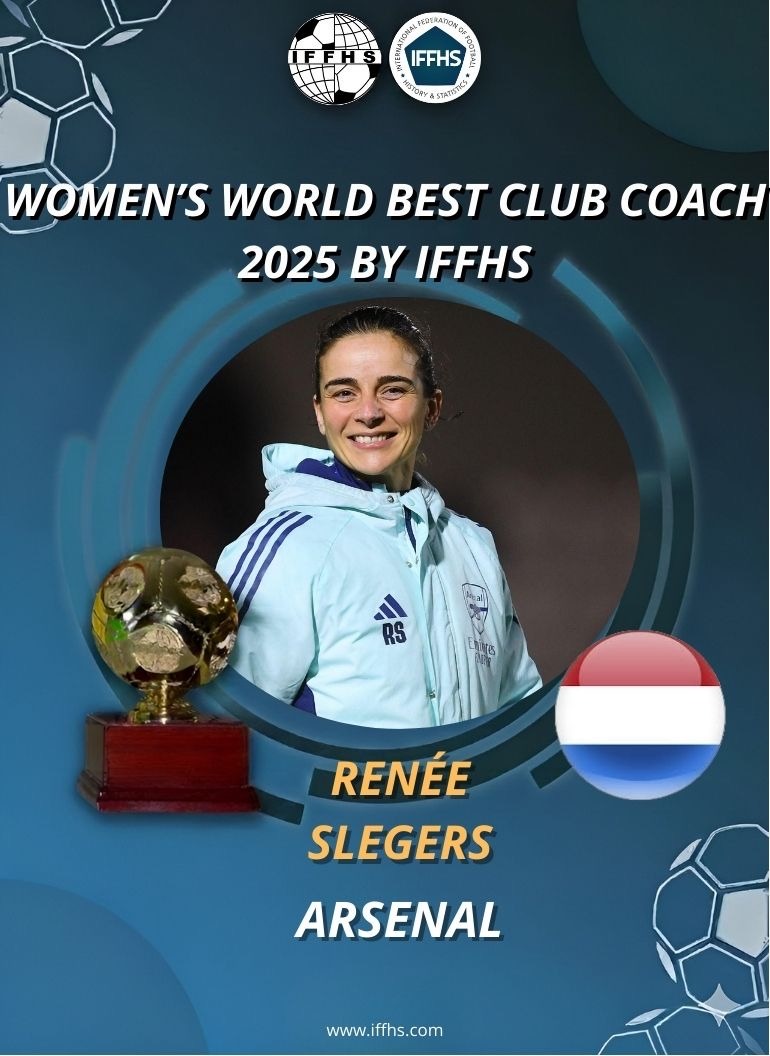 Champions League winner with Arsenal, Renée Slegers is also crowned as IFFHS World’s Best Club Coach 2025 ! With 145 points, she adds 20 points more than Père Romeu, FC Barcelona’s coach and 48 points more than Sonia Bompastor, Chelsea’s successfull coach, winner of the IFFHS Award 2022. Jonatan Giraldez, winner of the IFFHS Awards 2023 and 2024, takes rank 4.